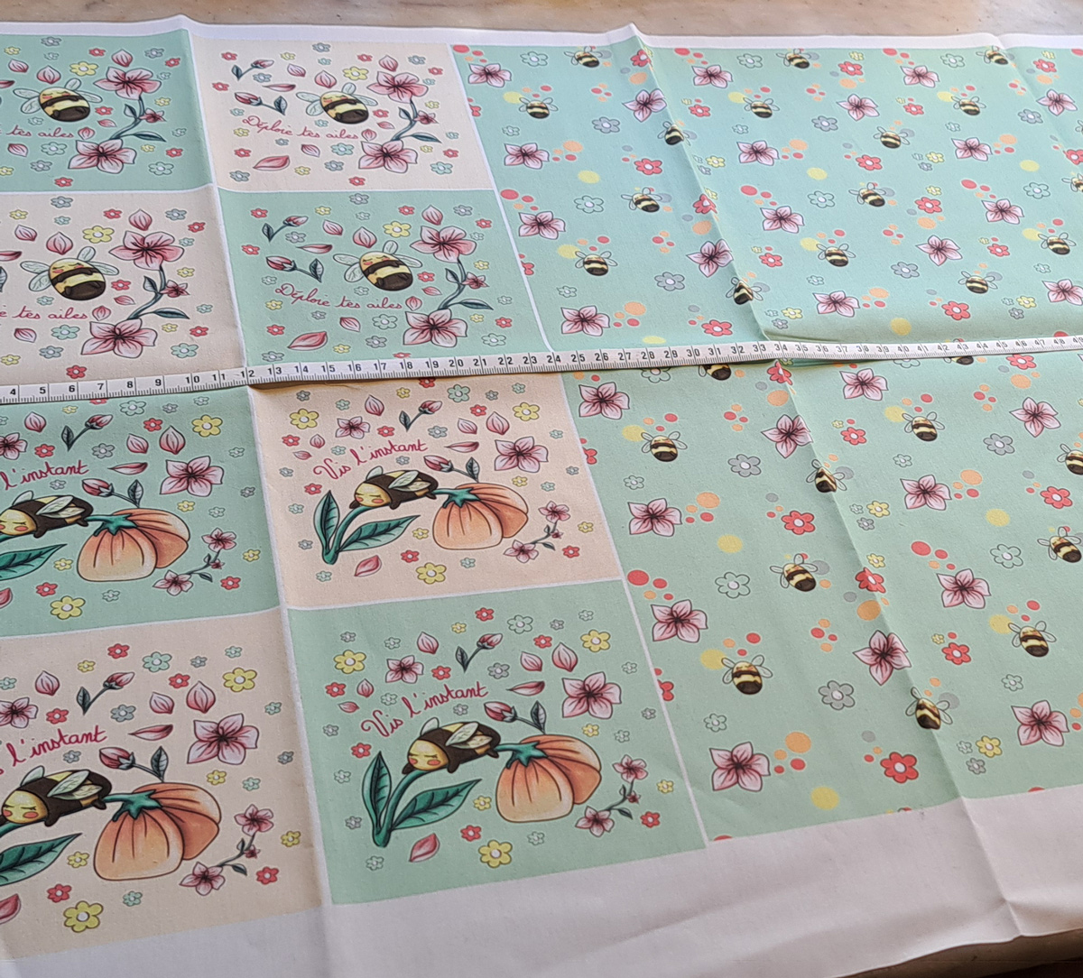 Nouveau – Coupon illustré 12 x 12 cm – Popeline gots et oeko-tex imprimé en France – DÉPLOIE TES AILES — fond vert d’eau