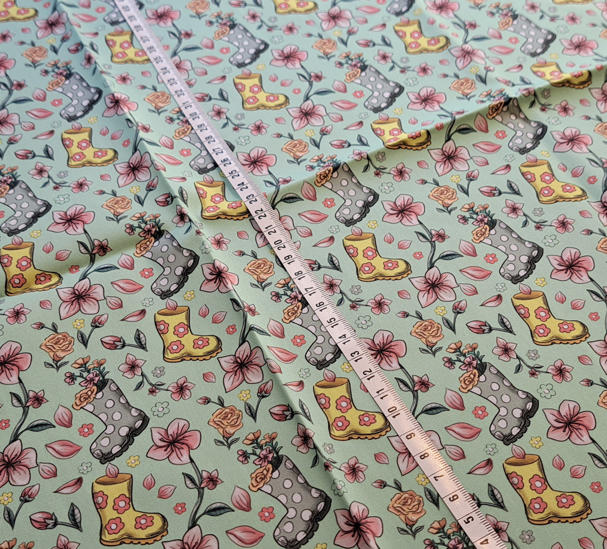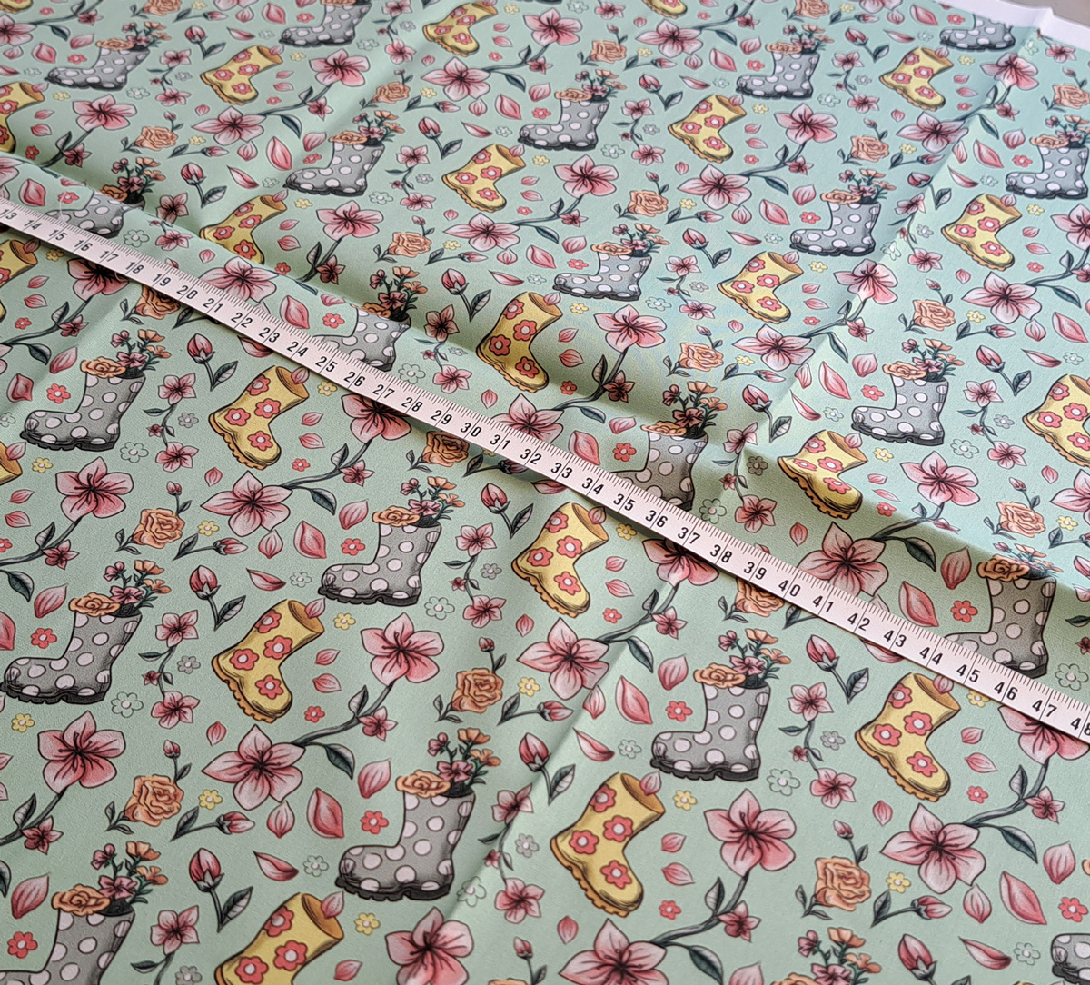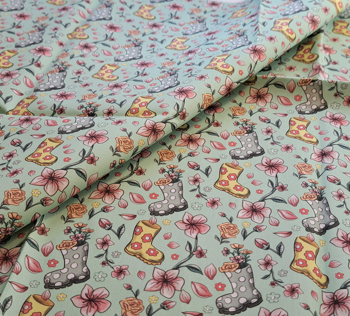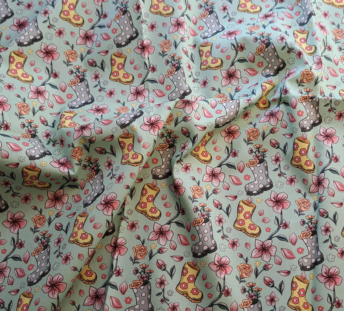 Nouveau – Popeline bio oeko-tex imprimé en France – Motif La Vie en Bottes- Fond Vert d’eau