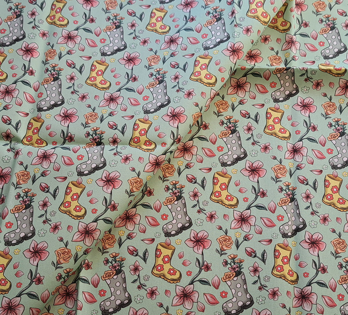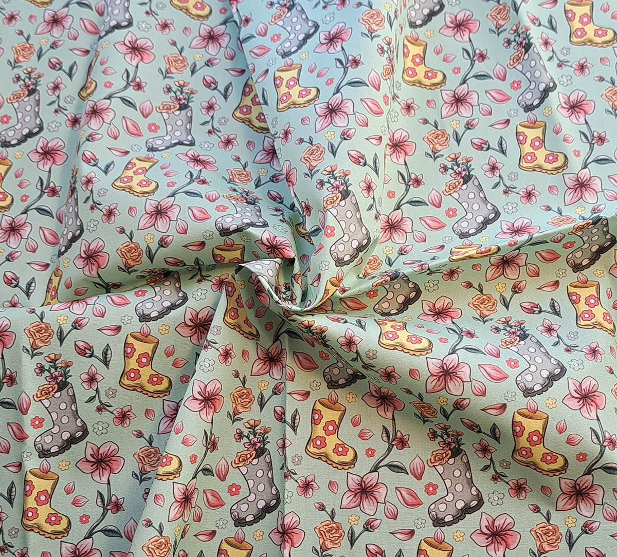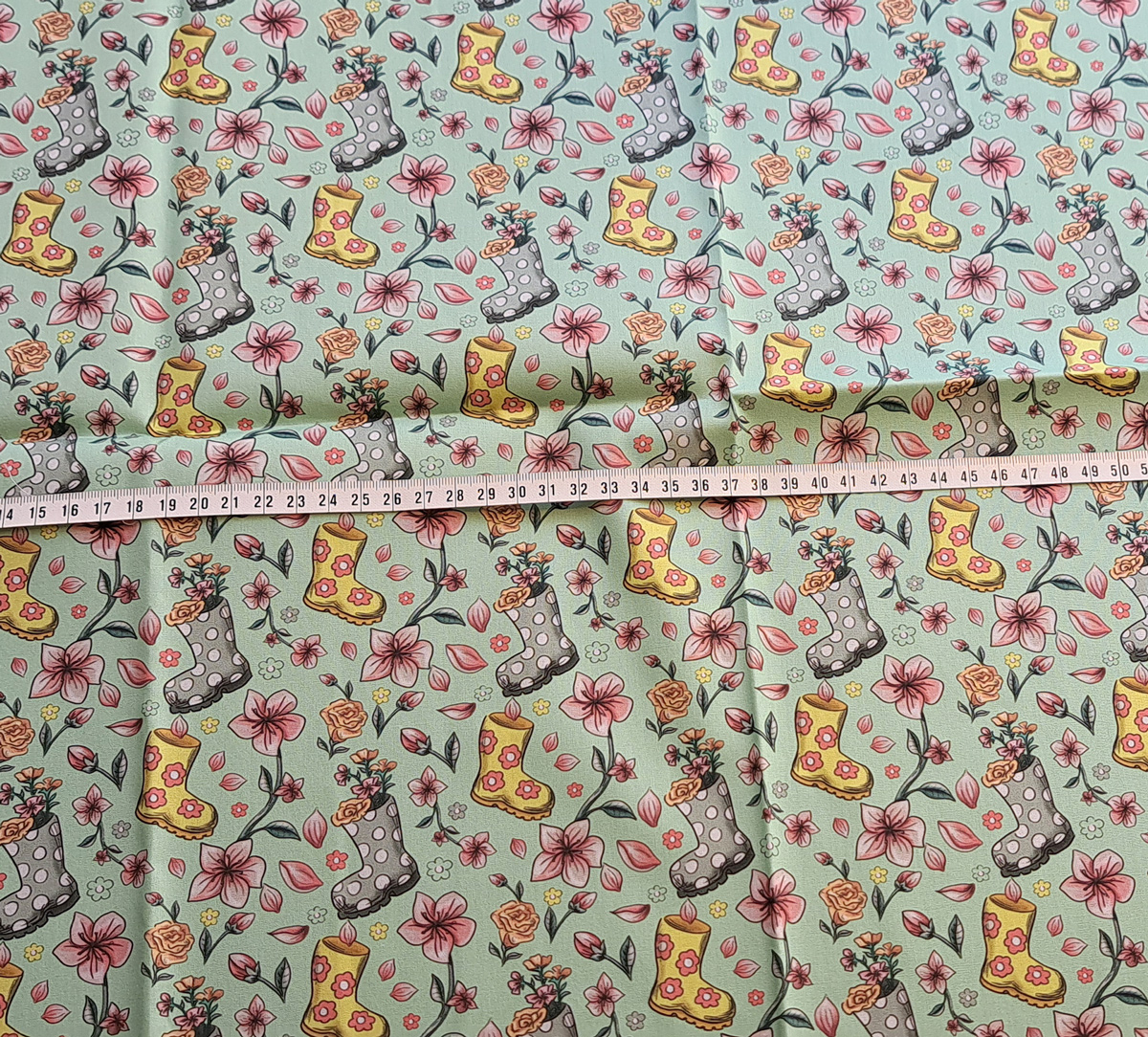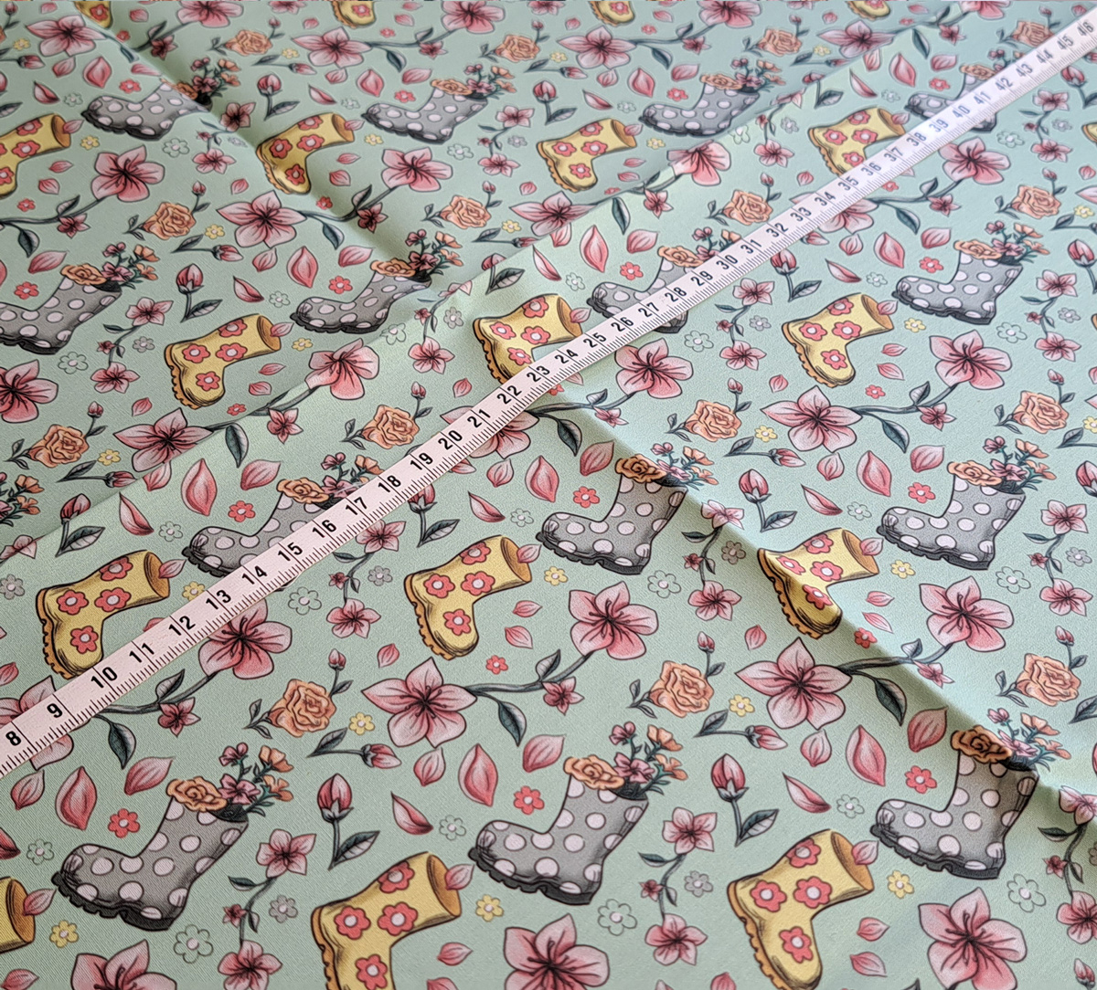 Nouveau – Popeline bio oeko-tex imprimé en France – Motif La Vie en Bottes- Fond Vert d’eau