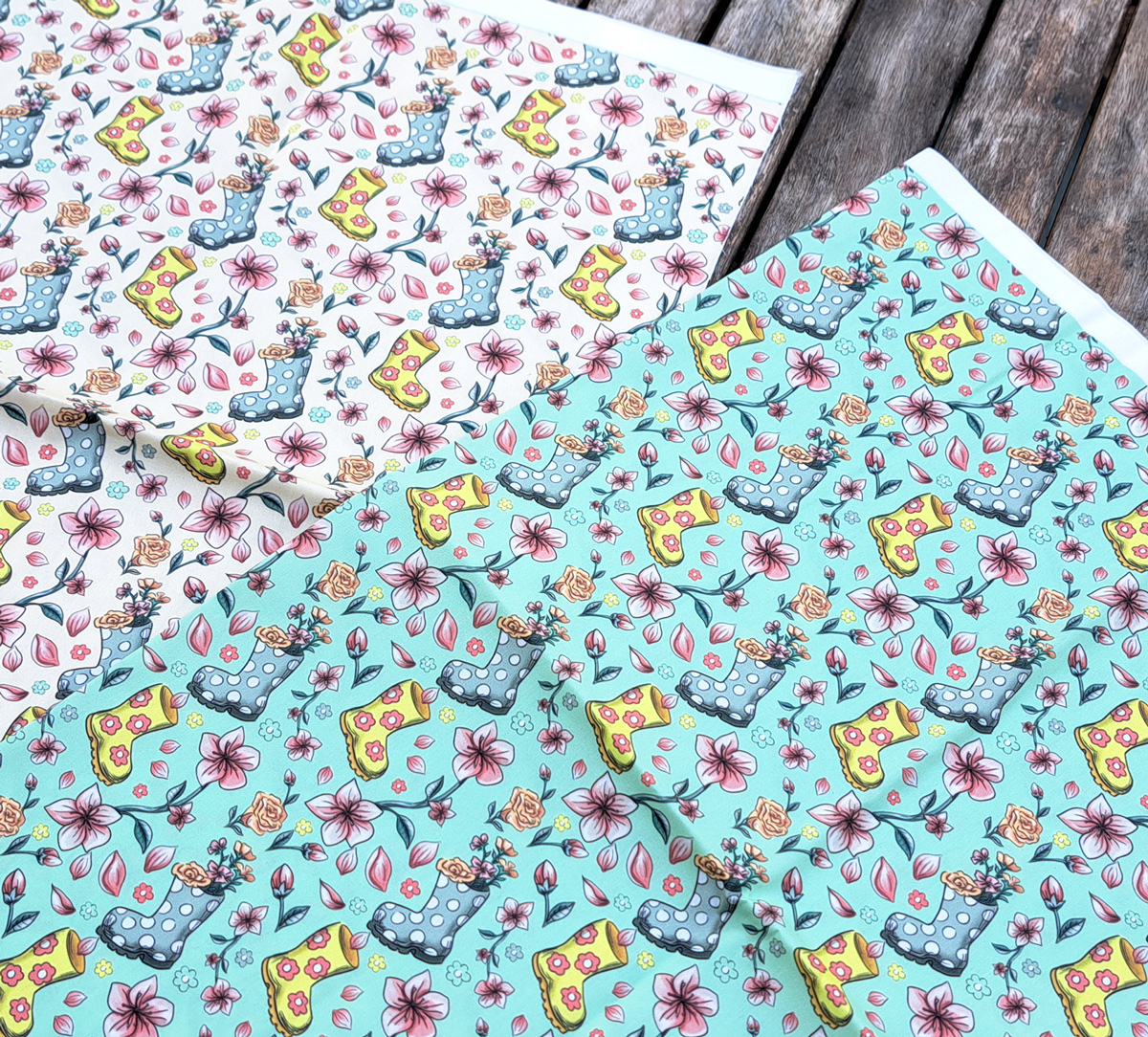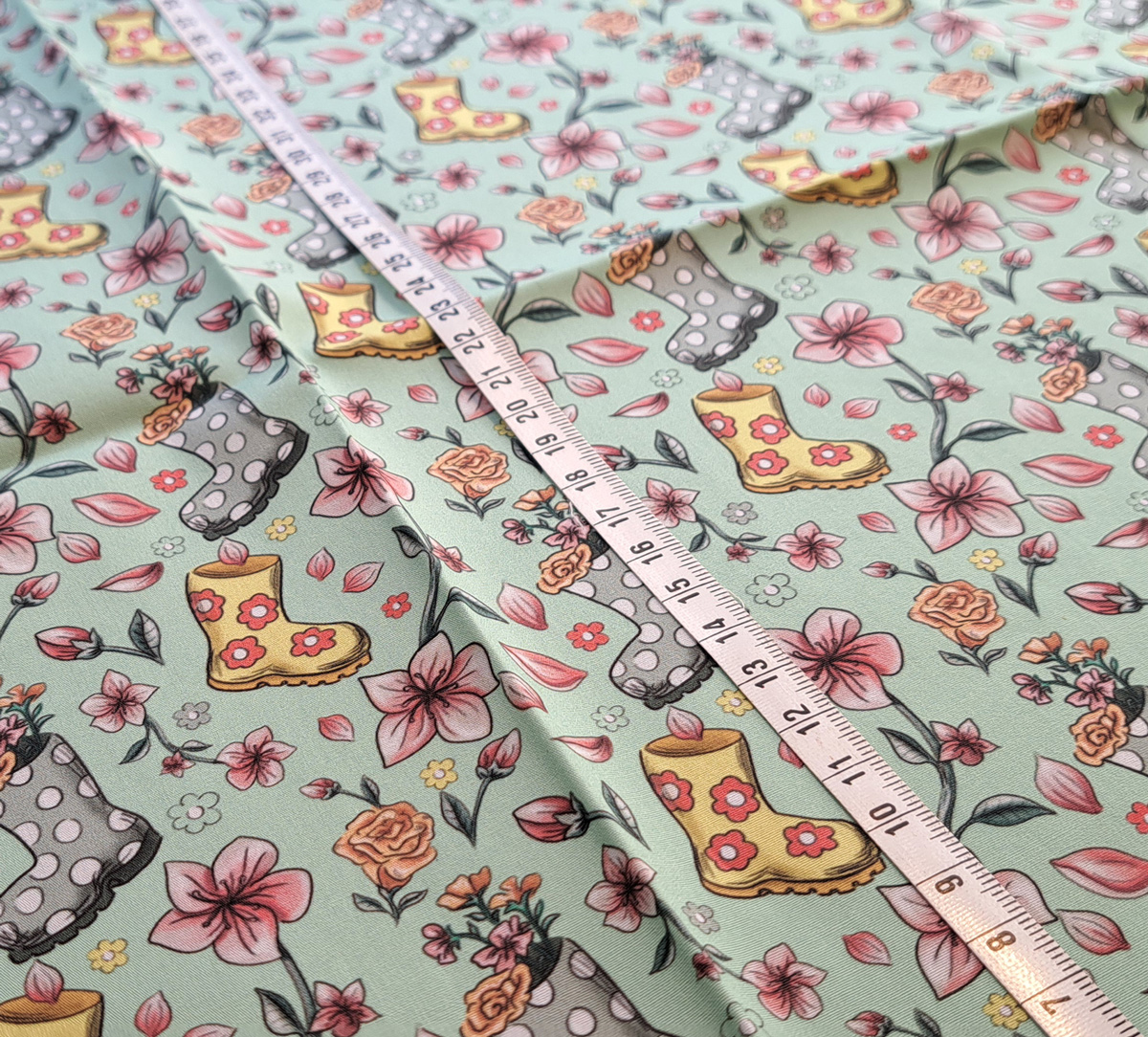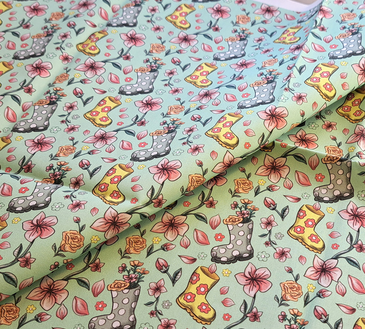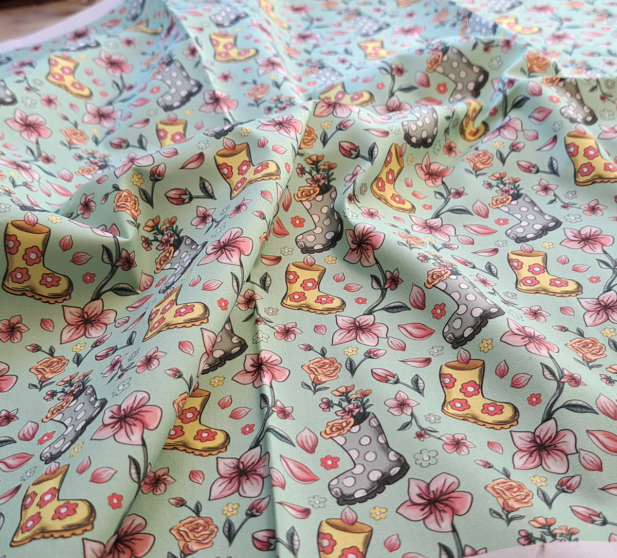 Nouveau – Popeline bio oeko-tex imprimé en France – Motif La Vie en Bottes- Fond Vert d’eau