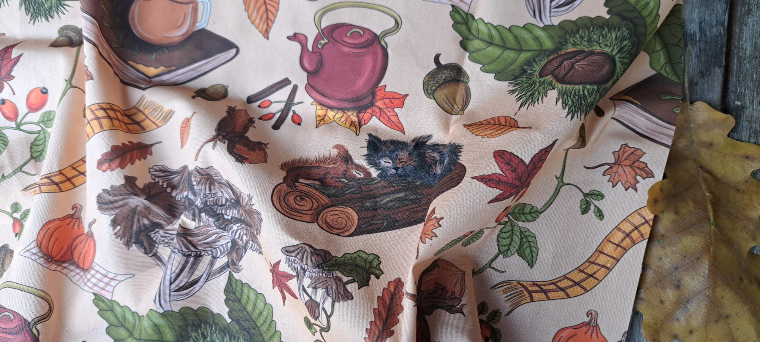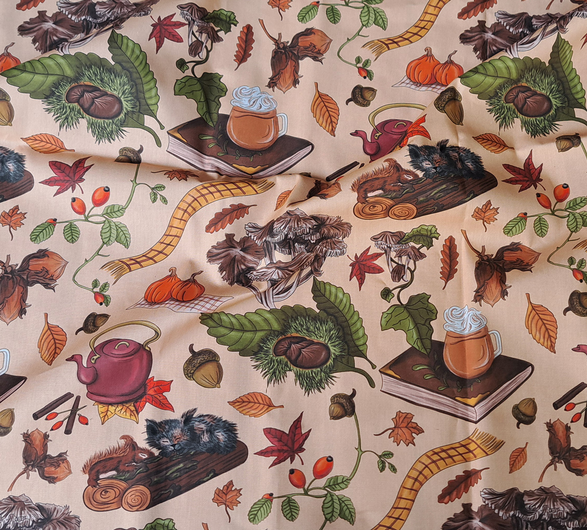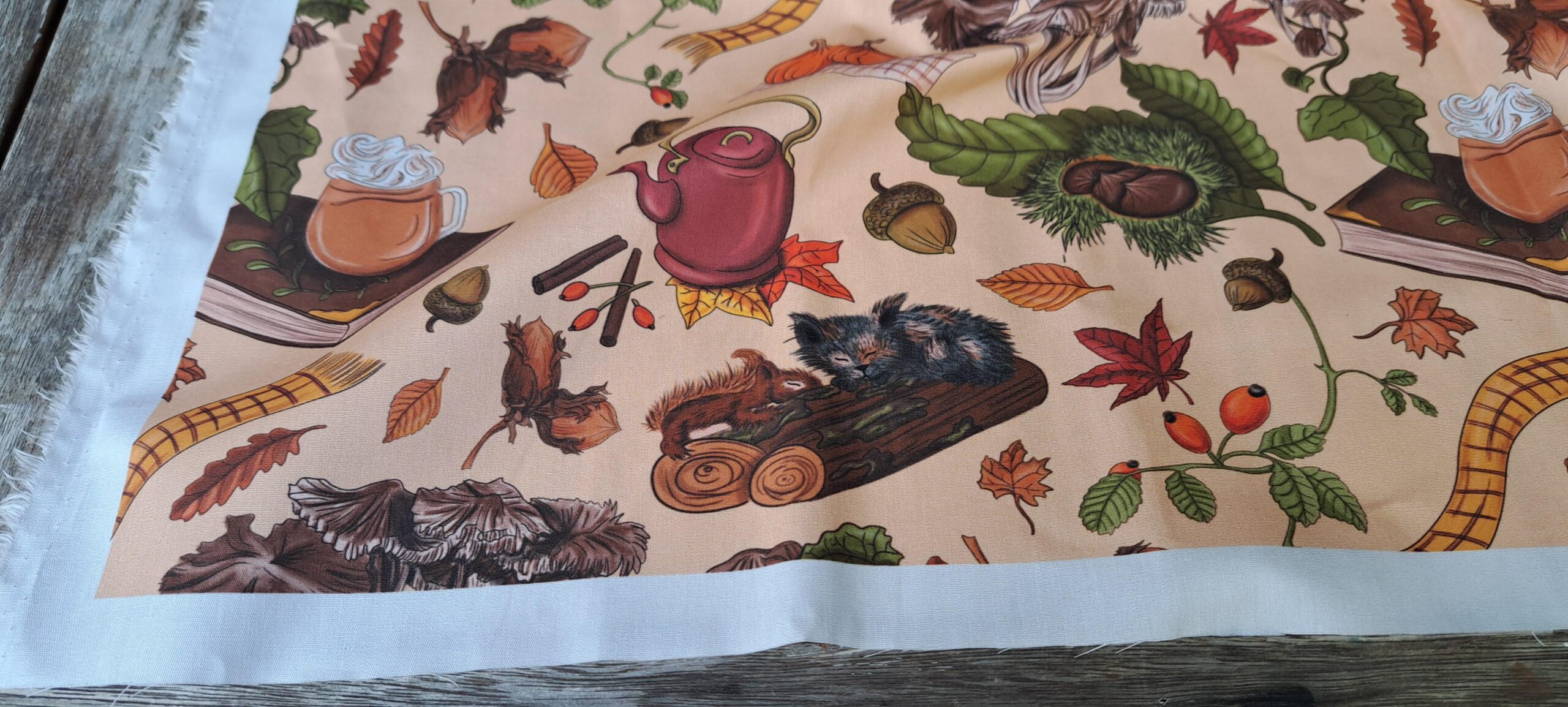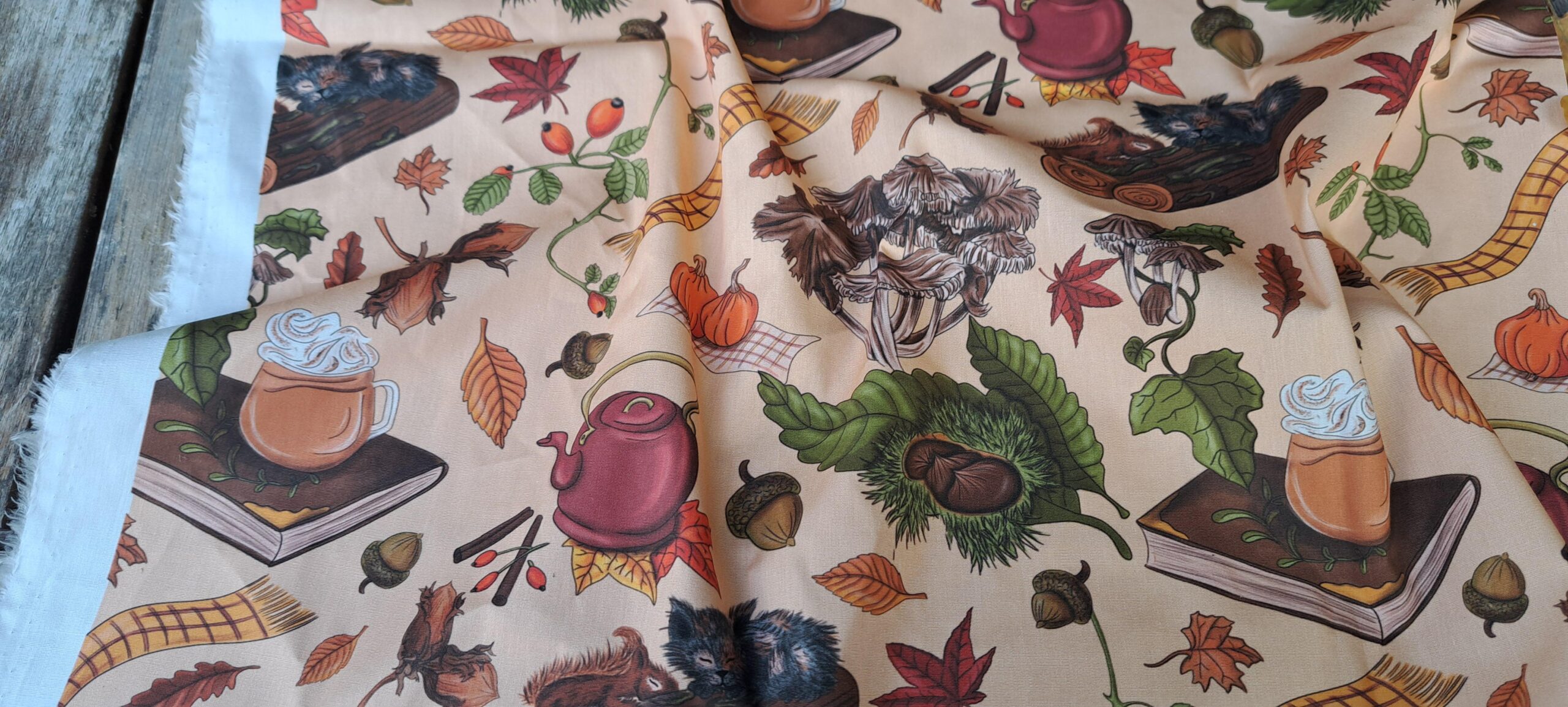 Illuminez vos créations avec la popeline Au Coin du Feu – trésors d’automne : chat et écureuil blottis, théière en cuivre, feuilles mortes, noisettes et champi’fées sur fond écru.