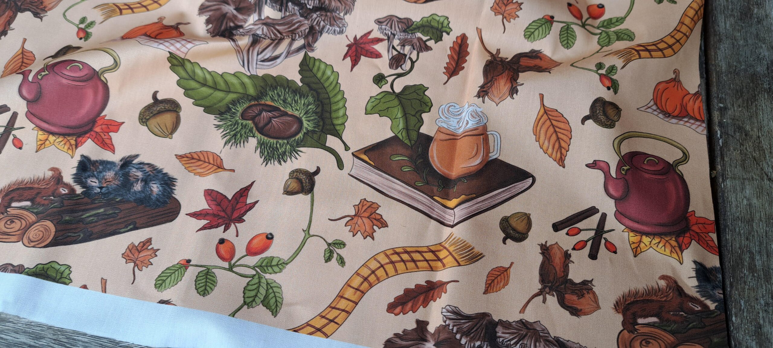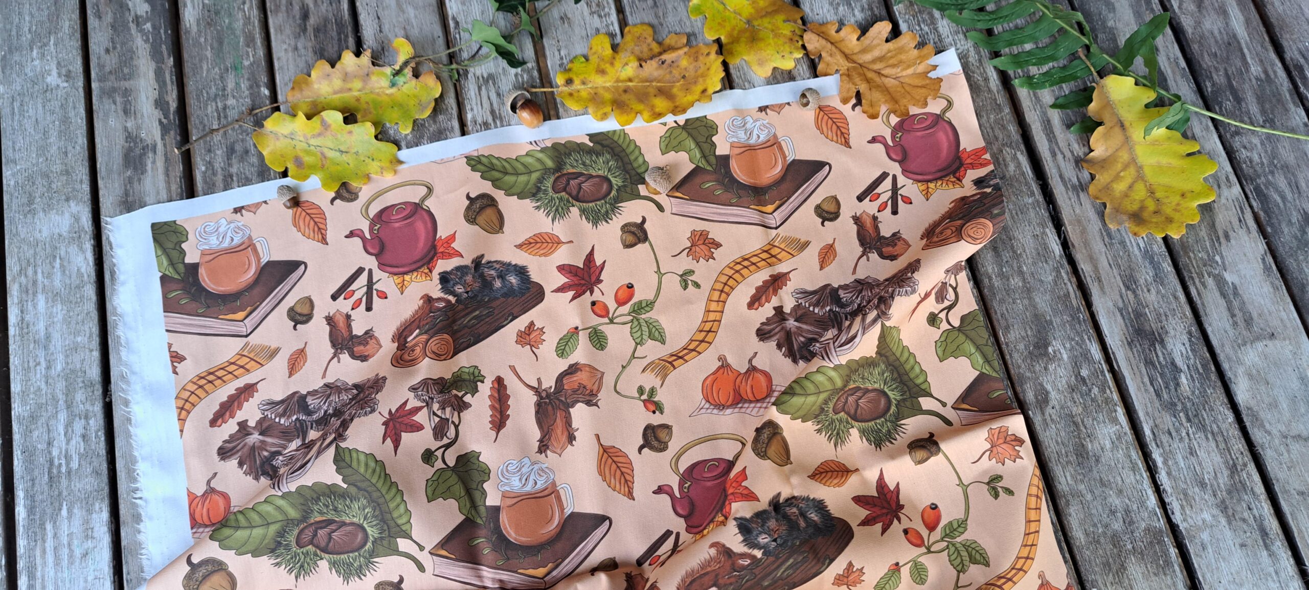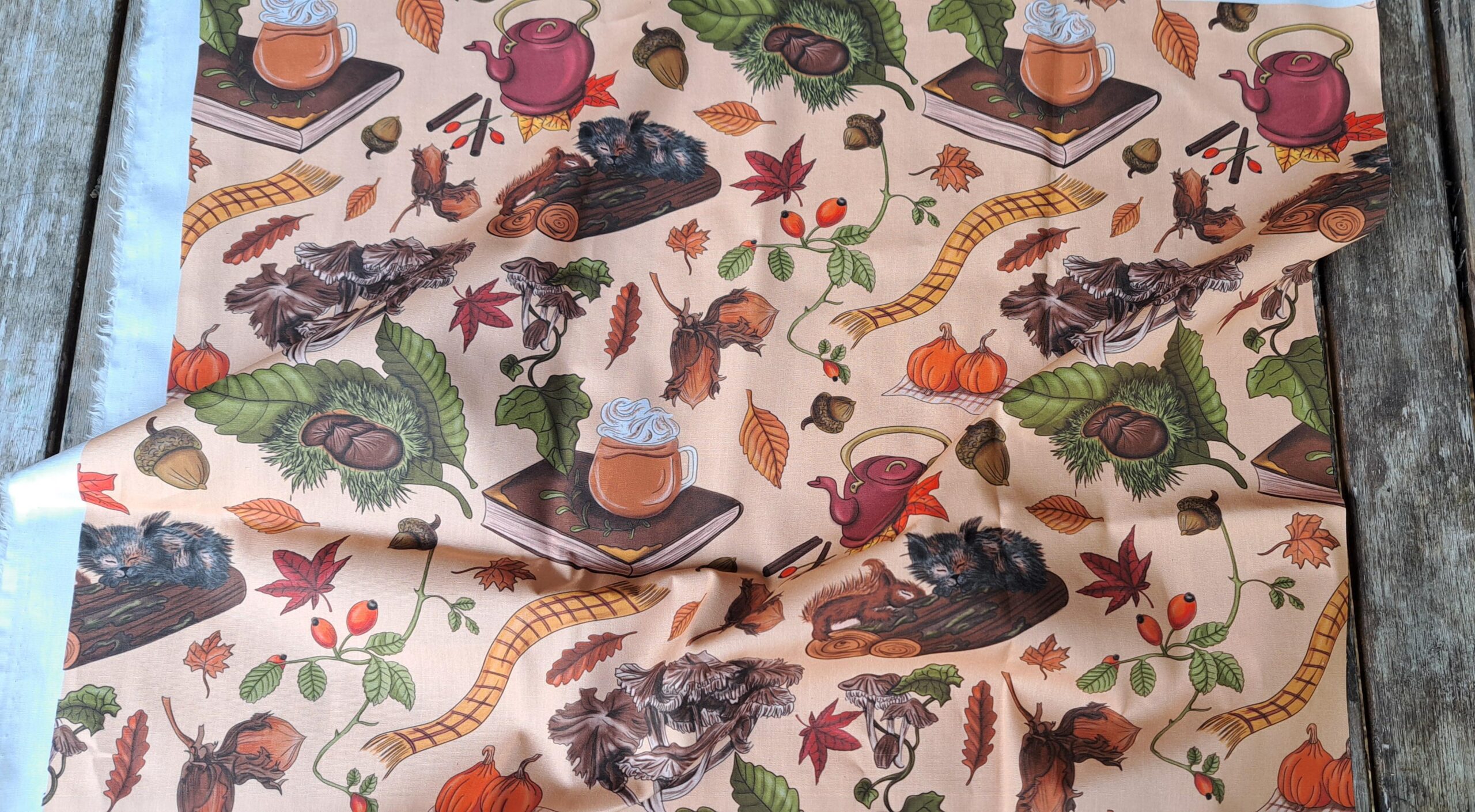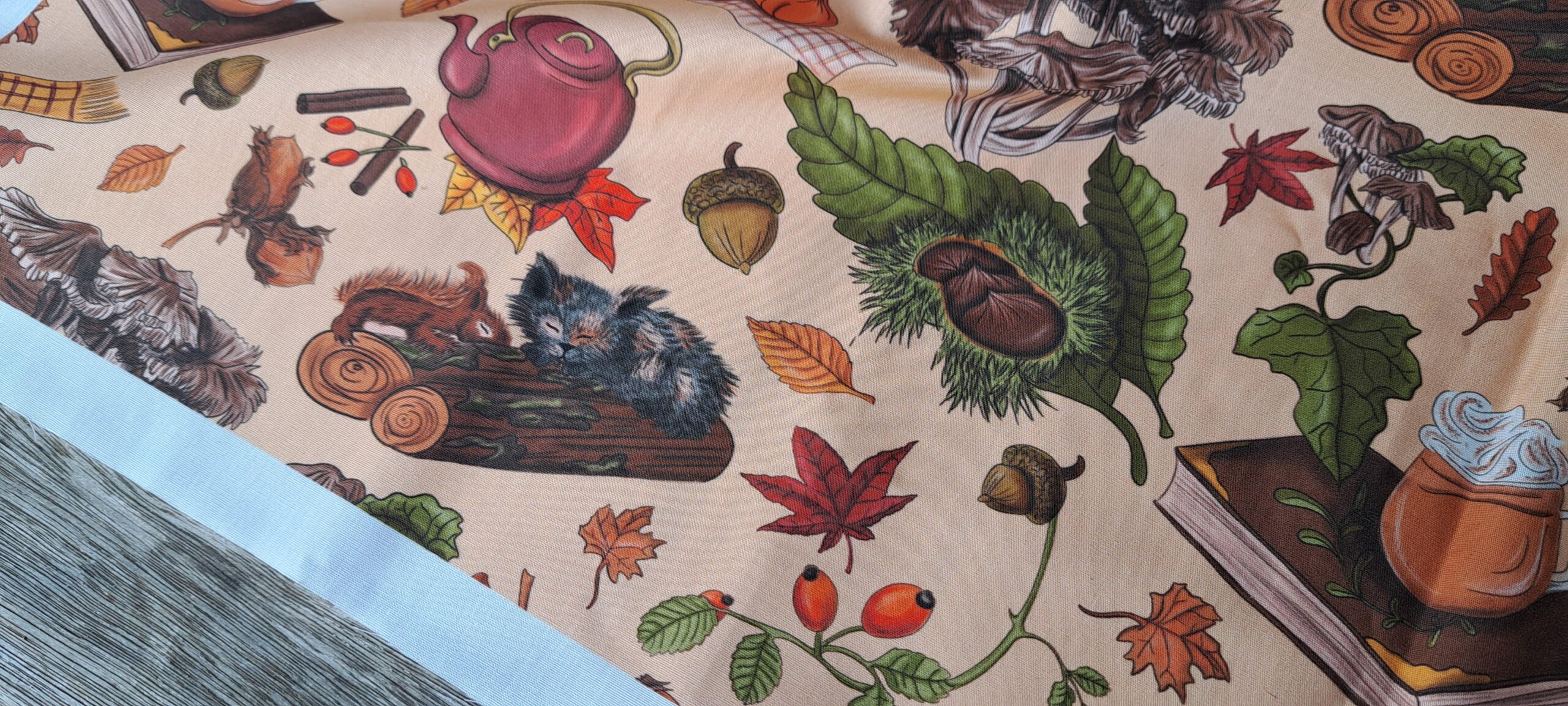 Illuminez vos créations avec la popeline Au Coin du Feu – trésors d’automne : chat et écureuil blottis, théière en cuivre, feuilles mortes, noisettes et champi’fées sur fond écru.