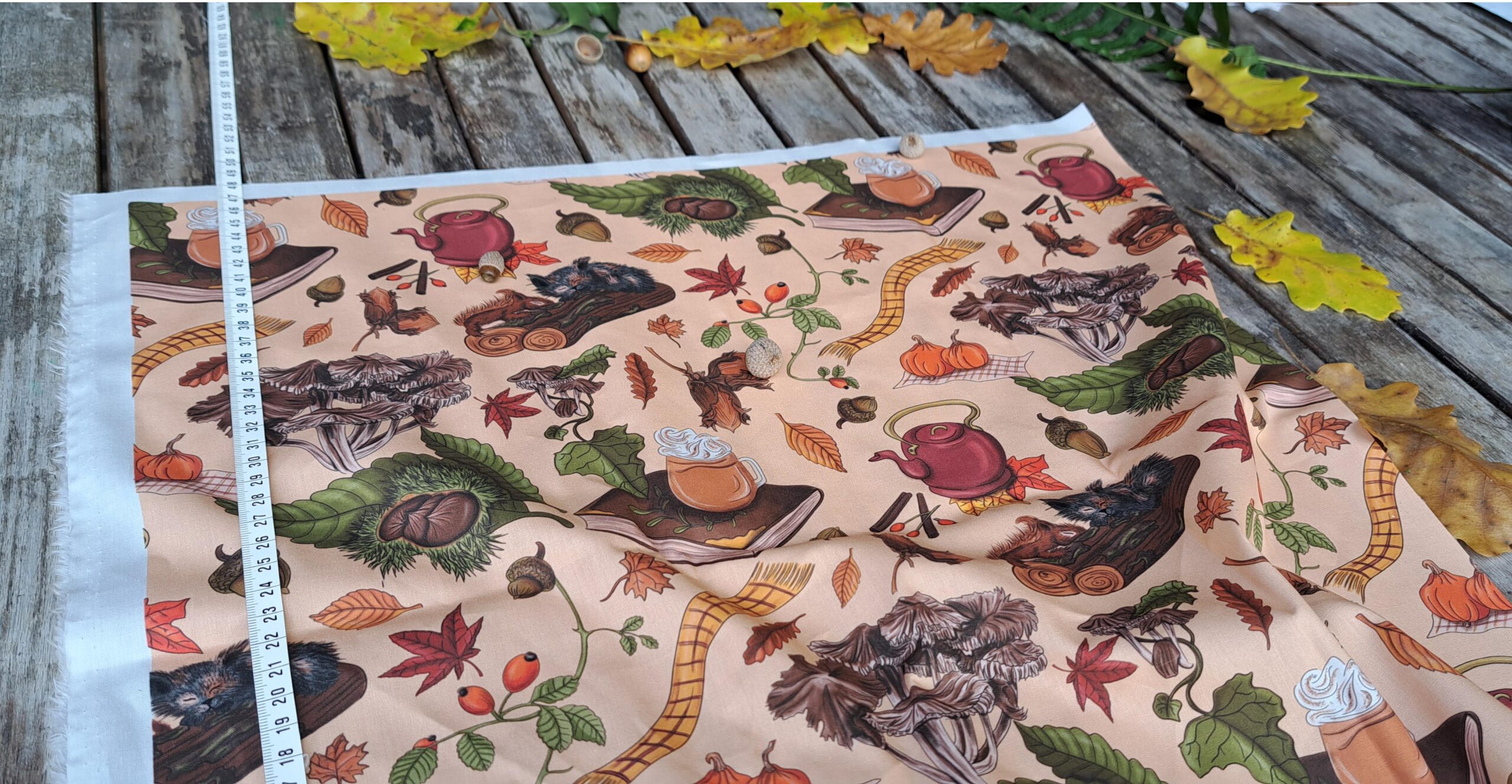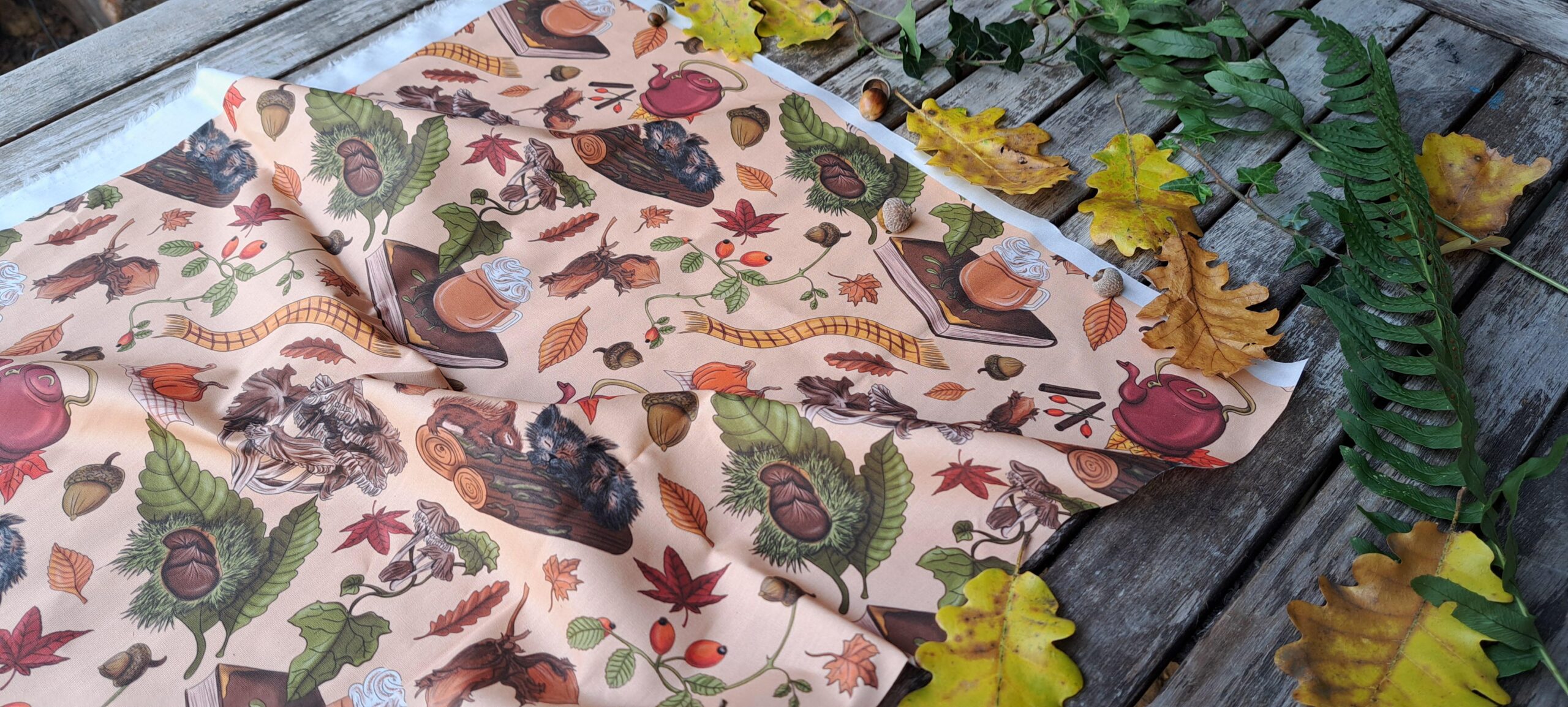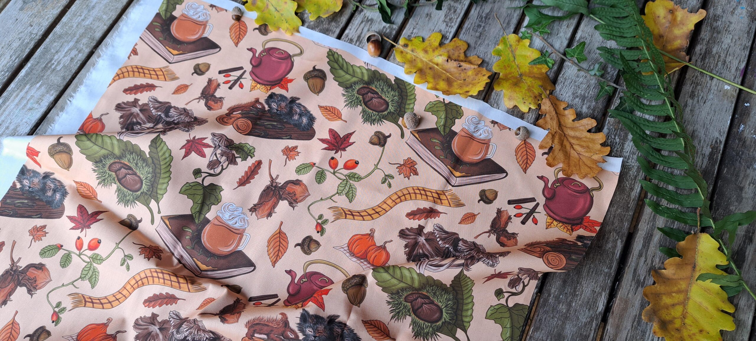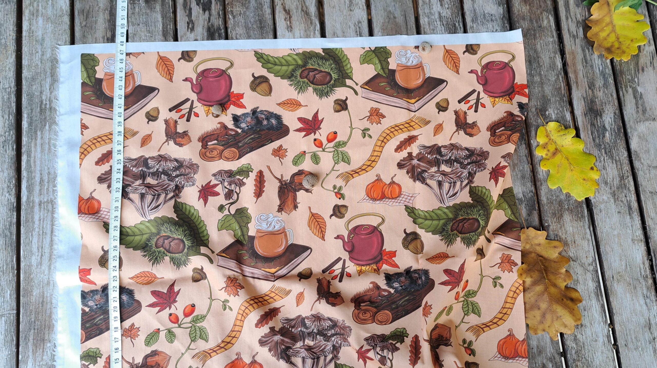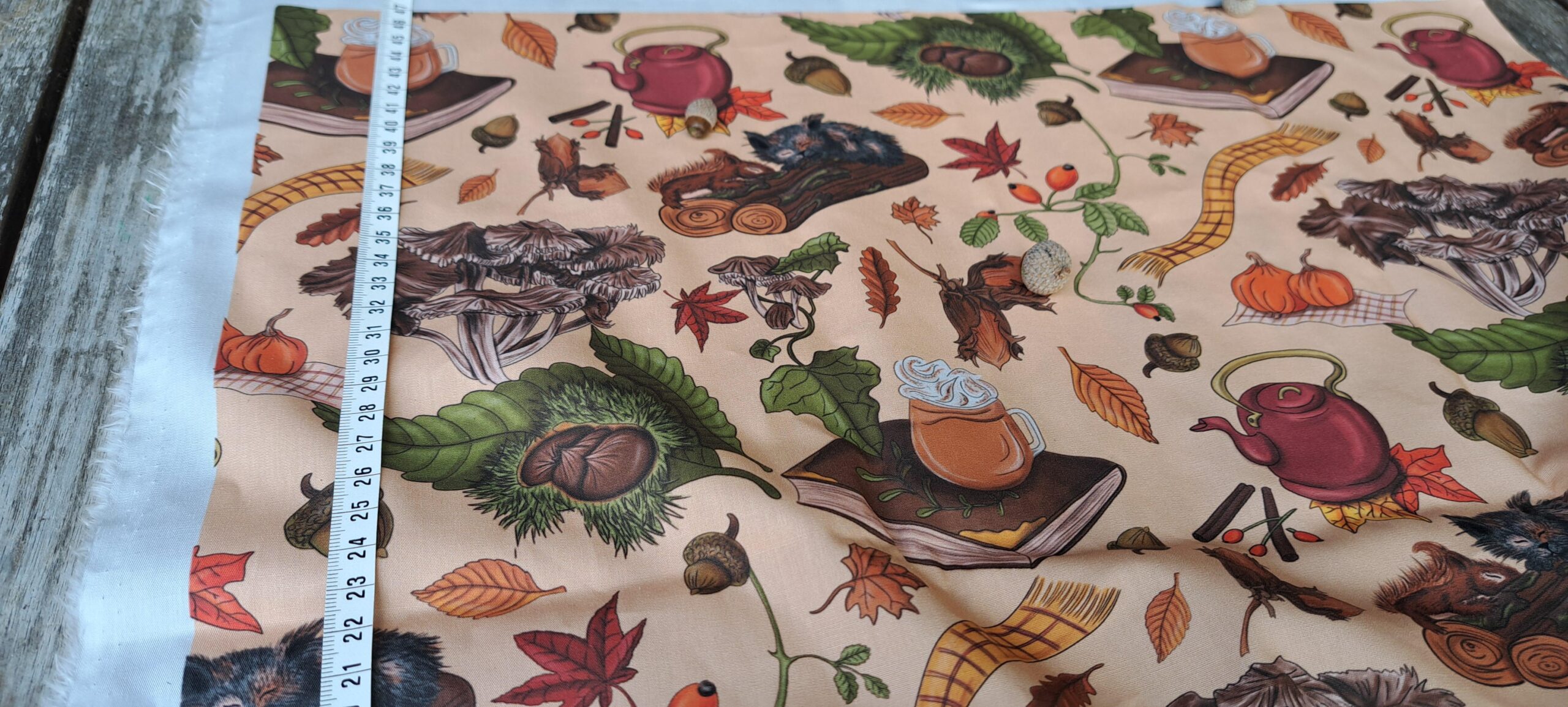 Illuminez vos créations avec la popeline Au Coin du Feu – trésors d’automne : chat et écureuil blottis, théière en cuivre, feuilles mortes, noisettes et champi’fées sur fond écru.