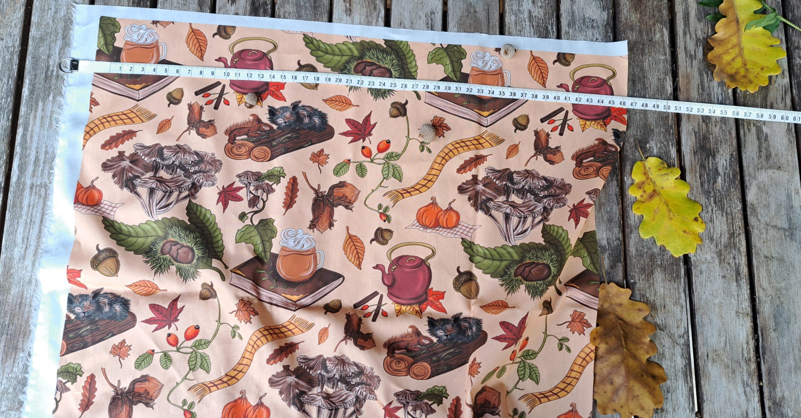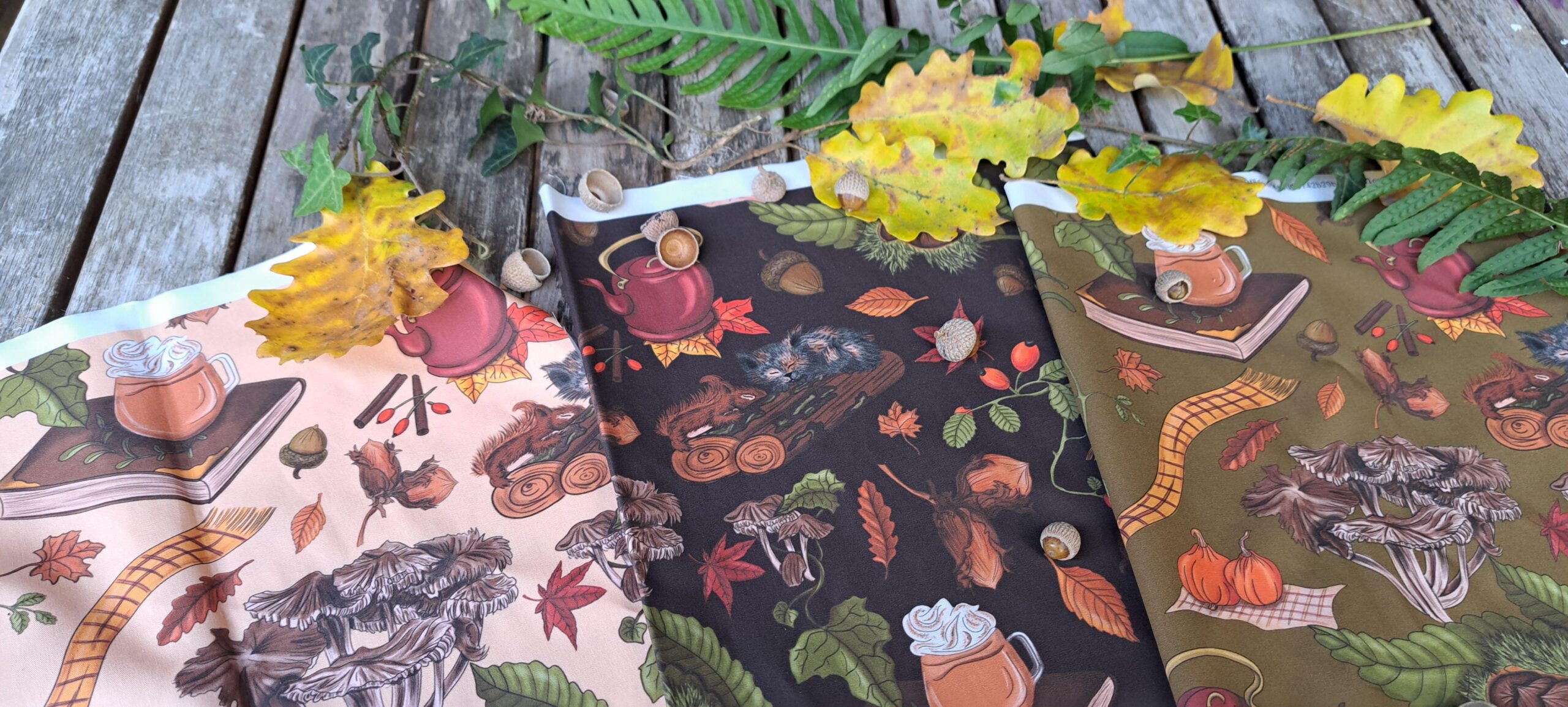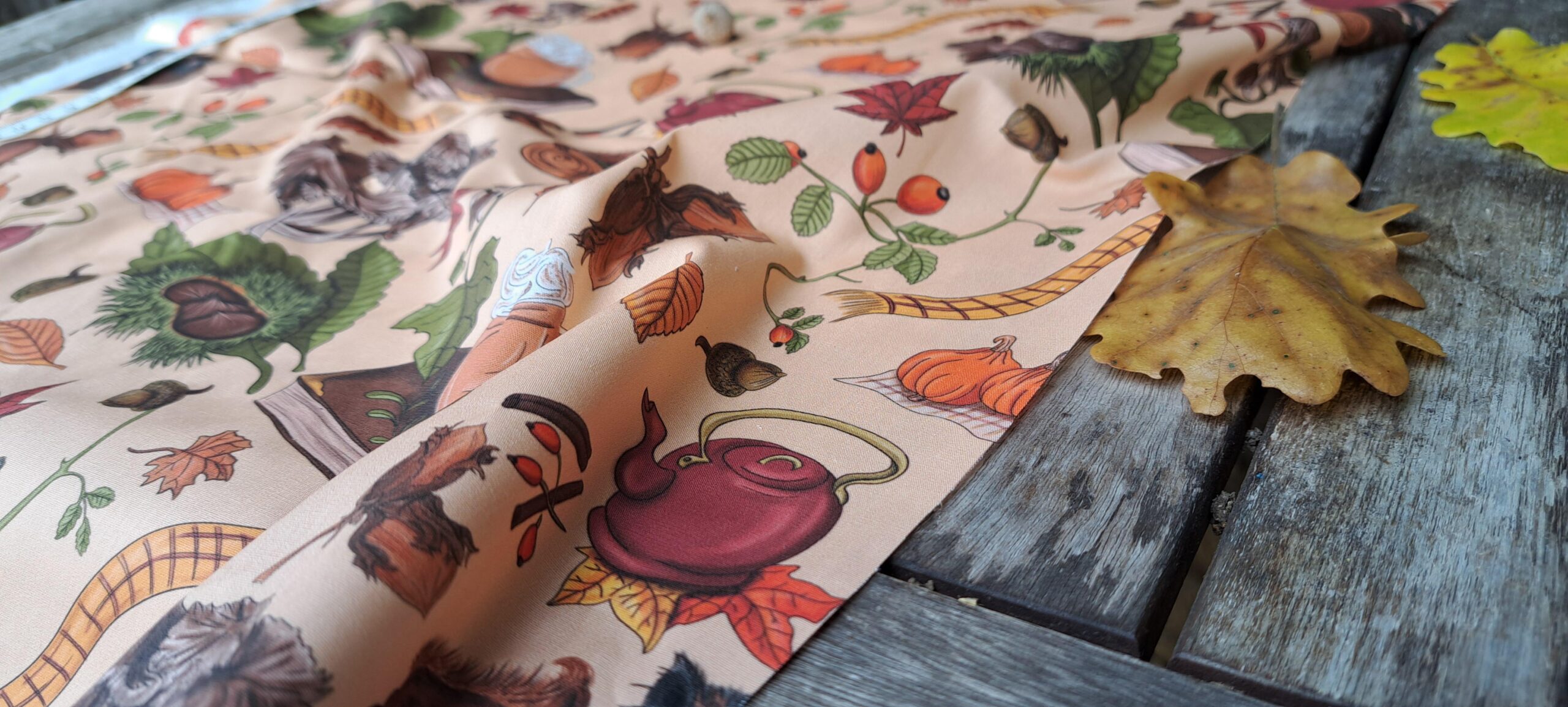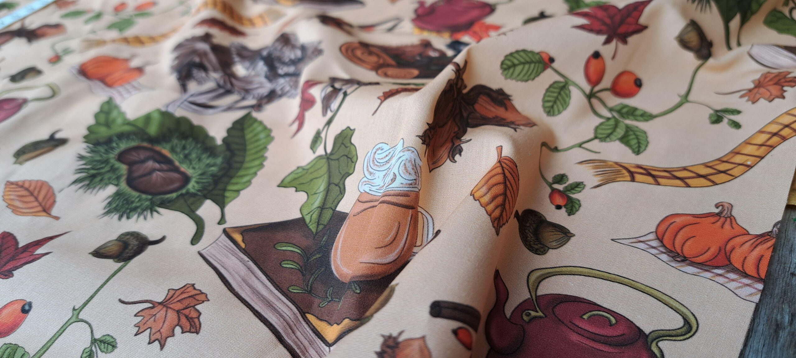 Illuminez vos créations avec la popeline Au Coin du Feu – trésors d’automne : chat et écureuil blottis, théière en cuivre, feuilles mortes, noisettes et champi’fées sur fond écru.