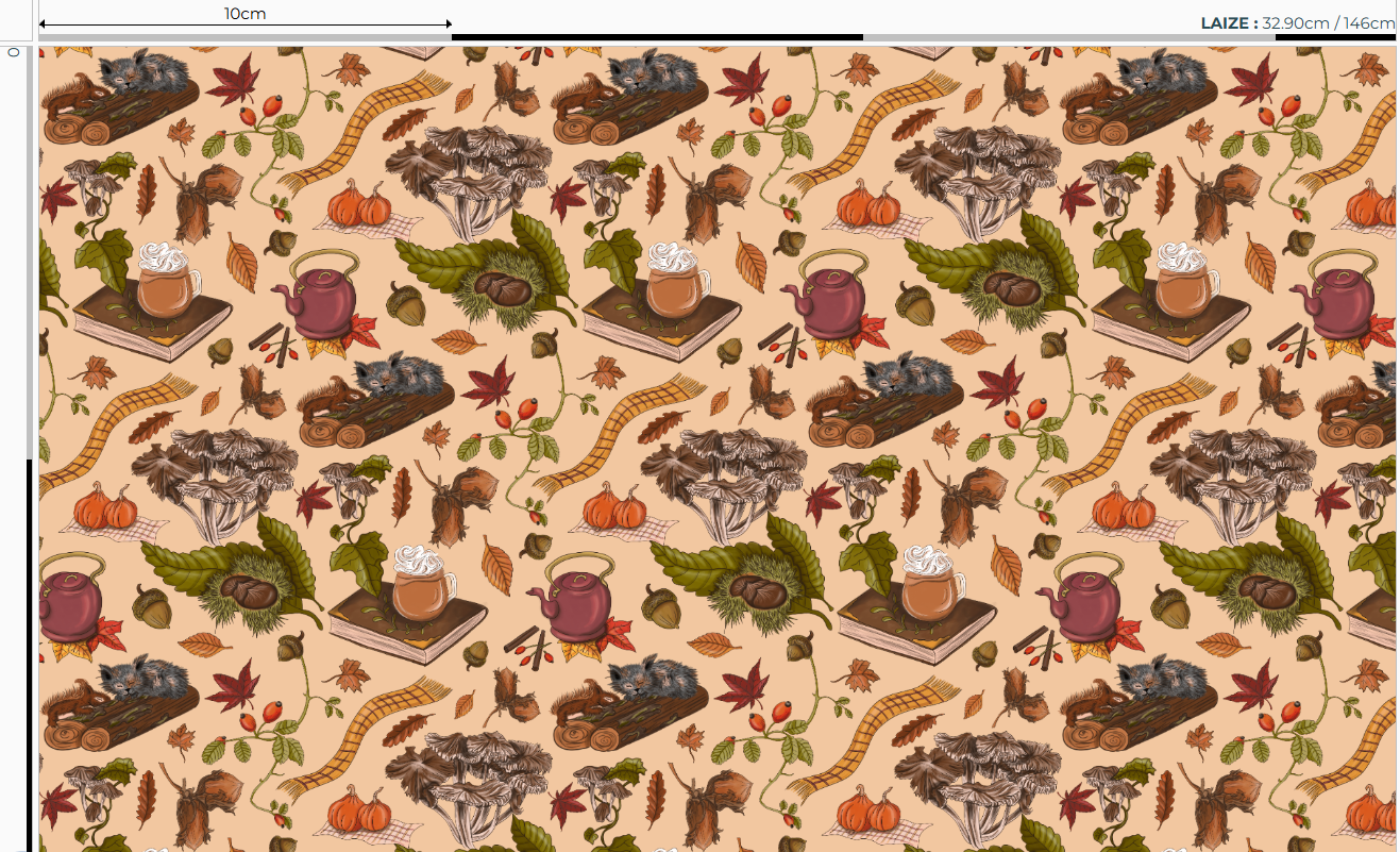 Illuminez vos créations avec le velours “Au Coin du Feu” – trésors d’automne : chat et écureuil blottis, théière en cuivre, feuilles d’érable, noisettes et champi’fées sur fond écru lumineux.