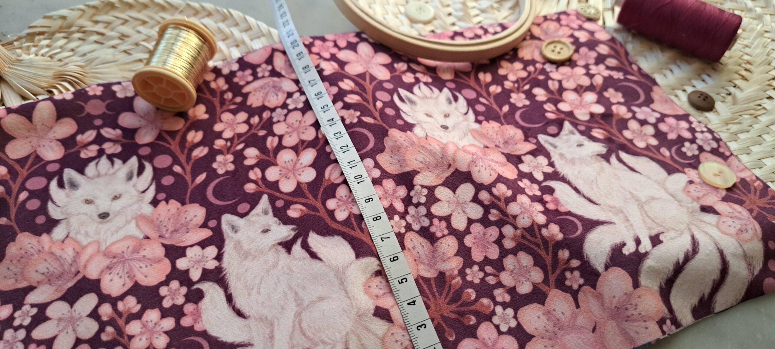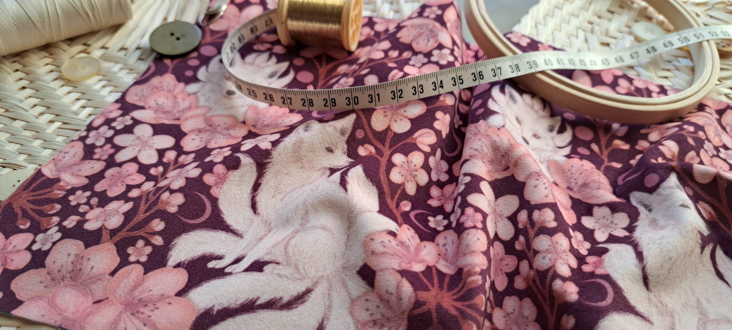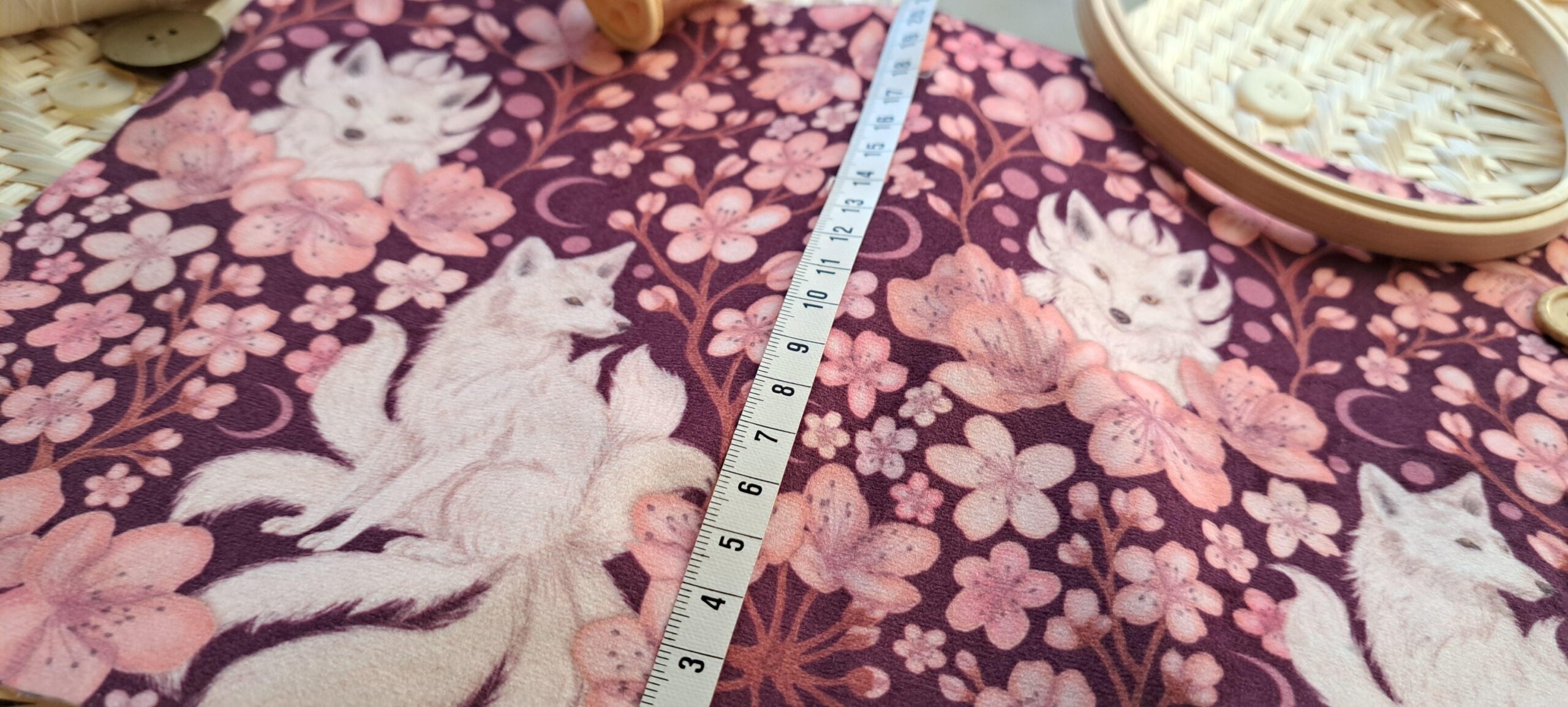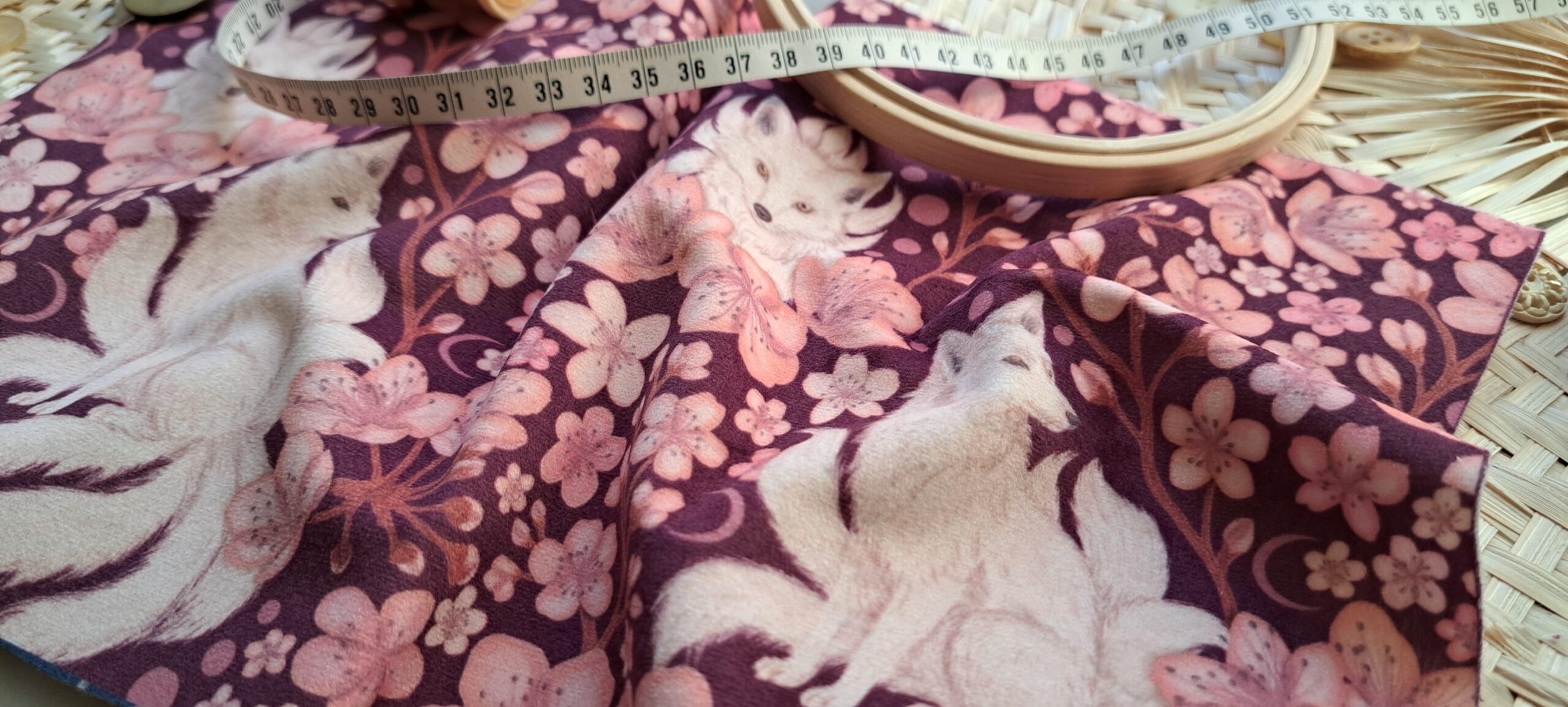 Velours oeko-tex imprimé en France – Motif Kitsune – Le Vent des Cerisiers – Fond Cerisier