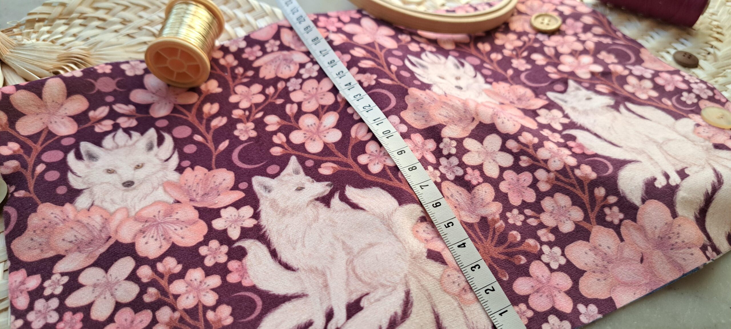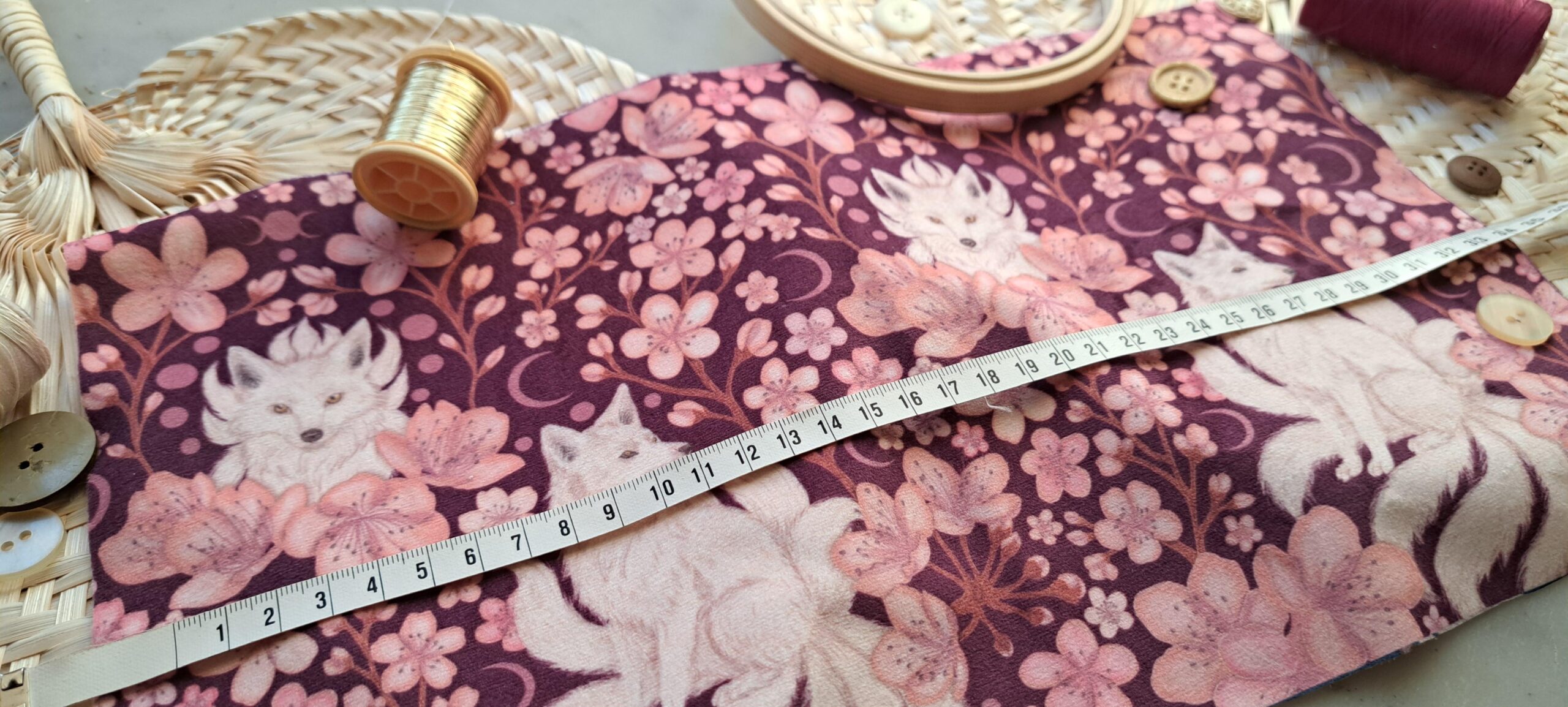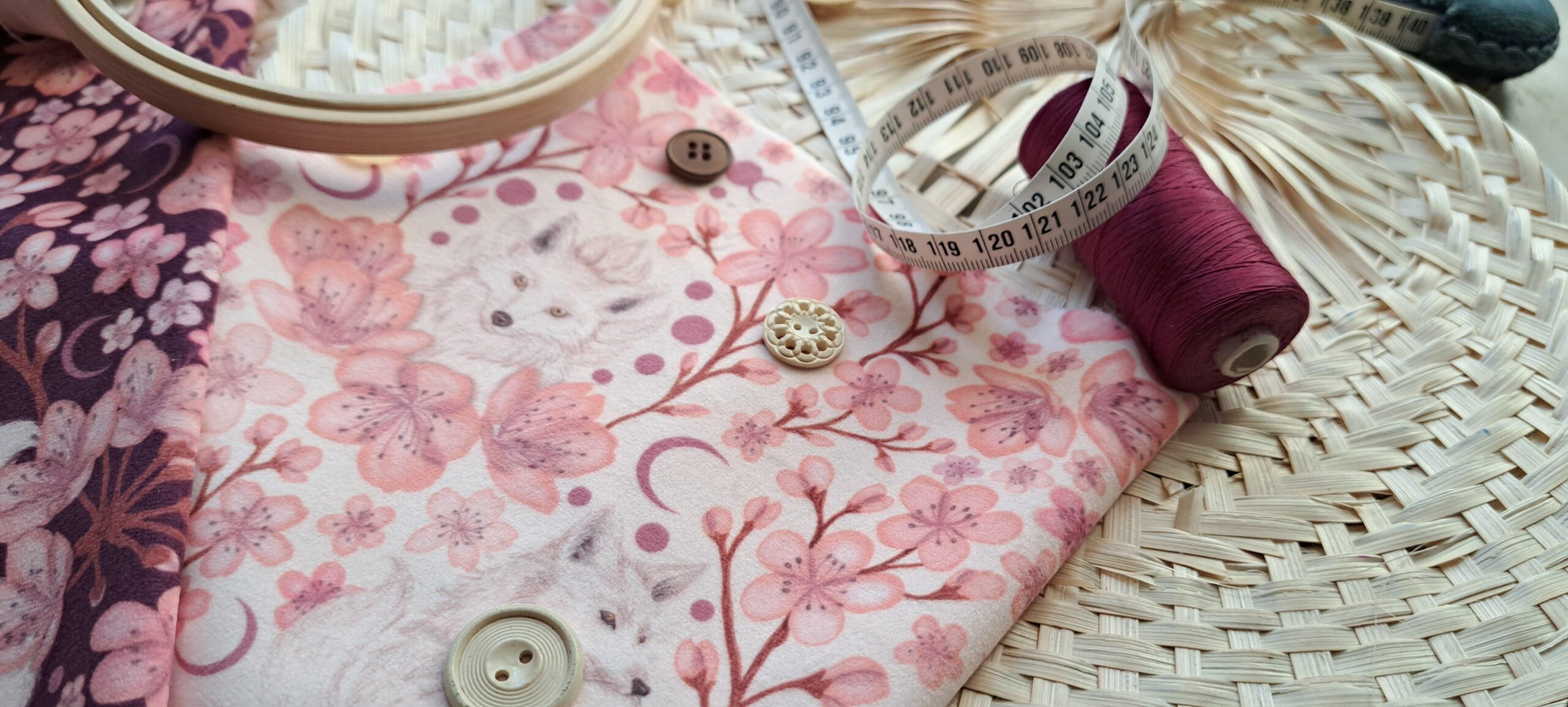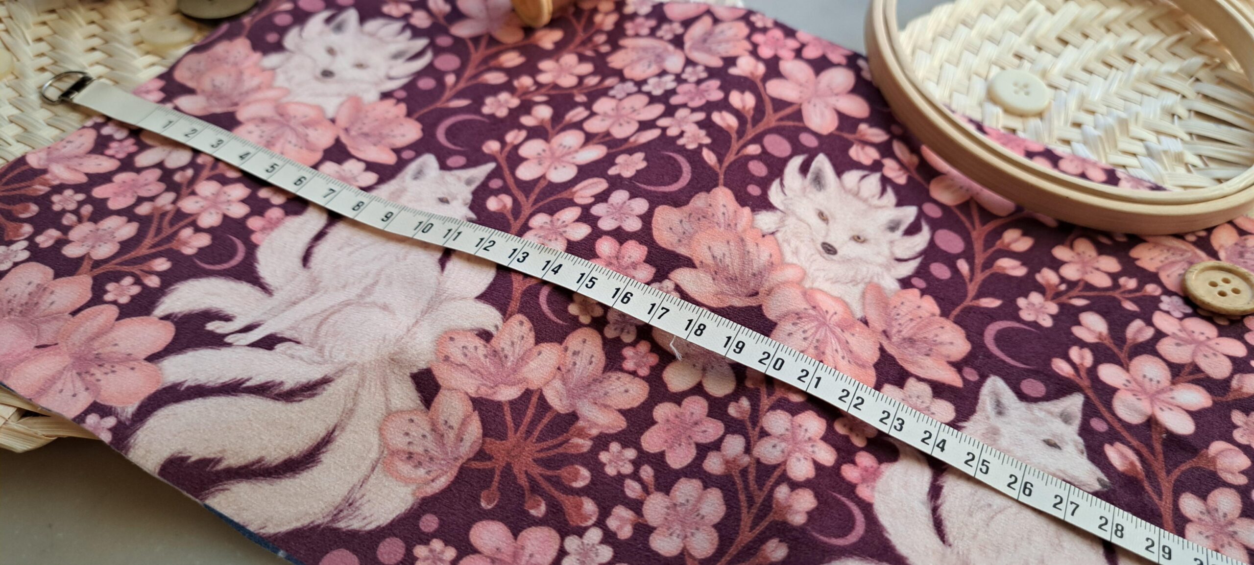 Velours oeko-tex imprimé en France – Motif Kitsune – Le Vent des Cerisiers – Fond Cerisier