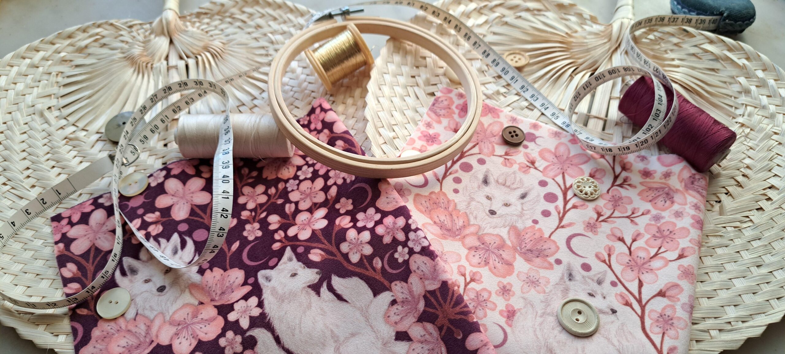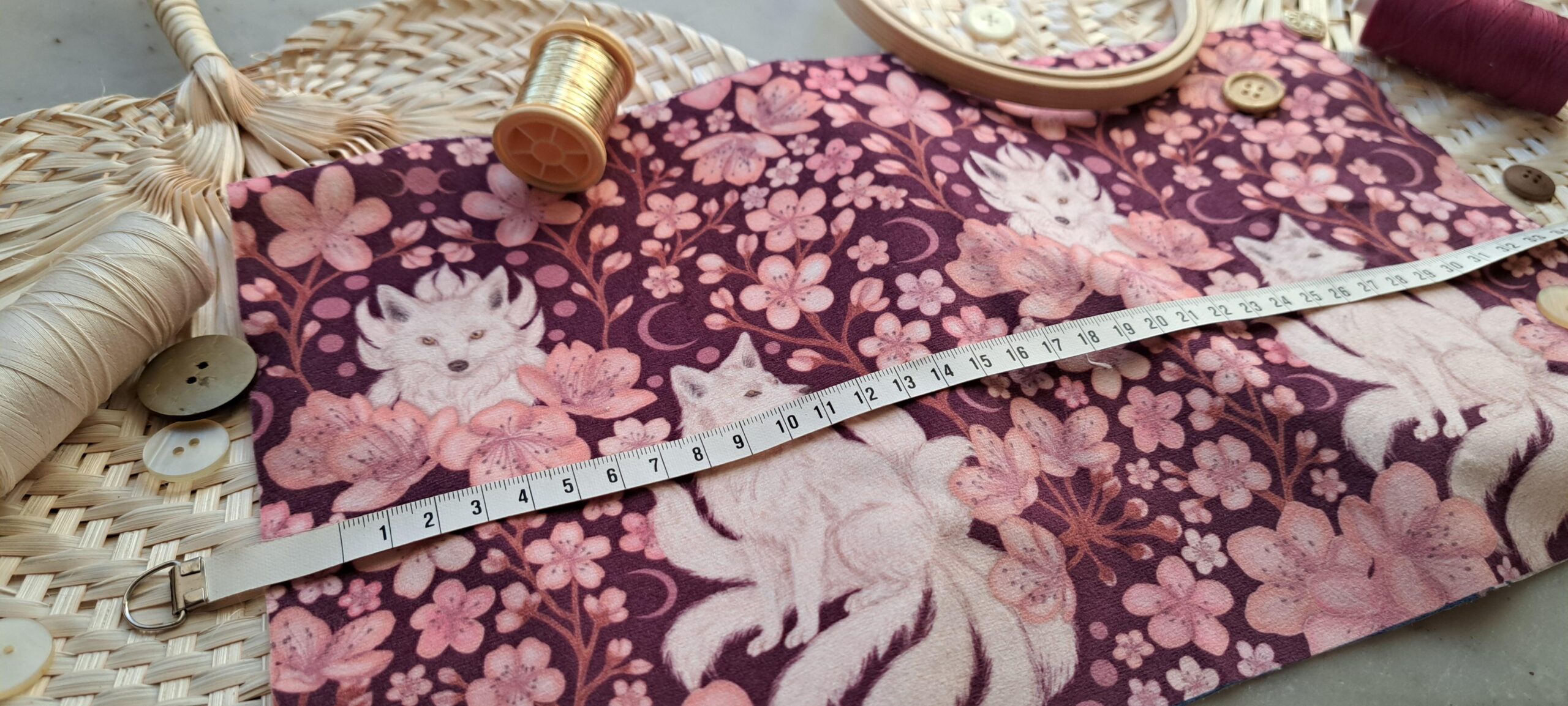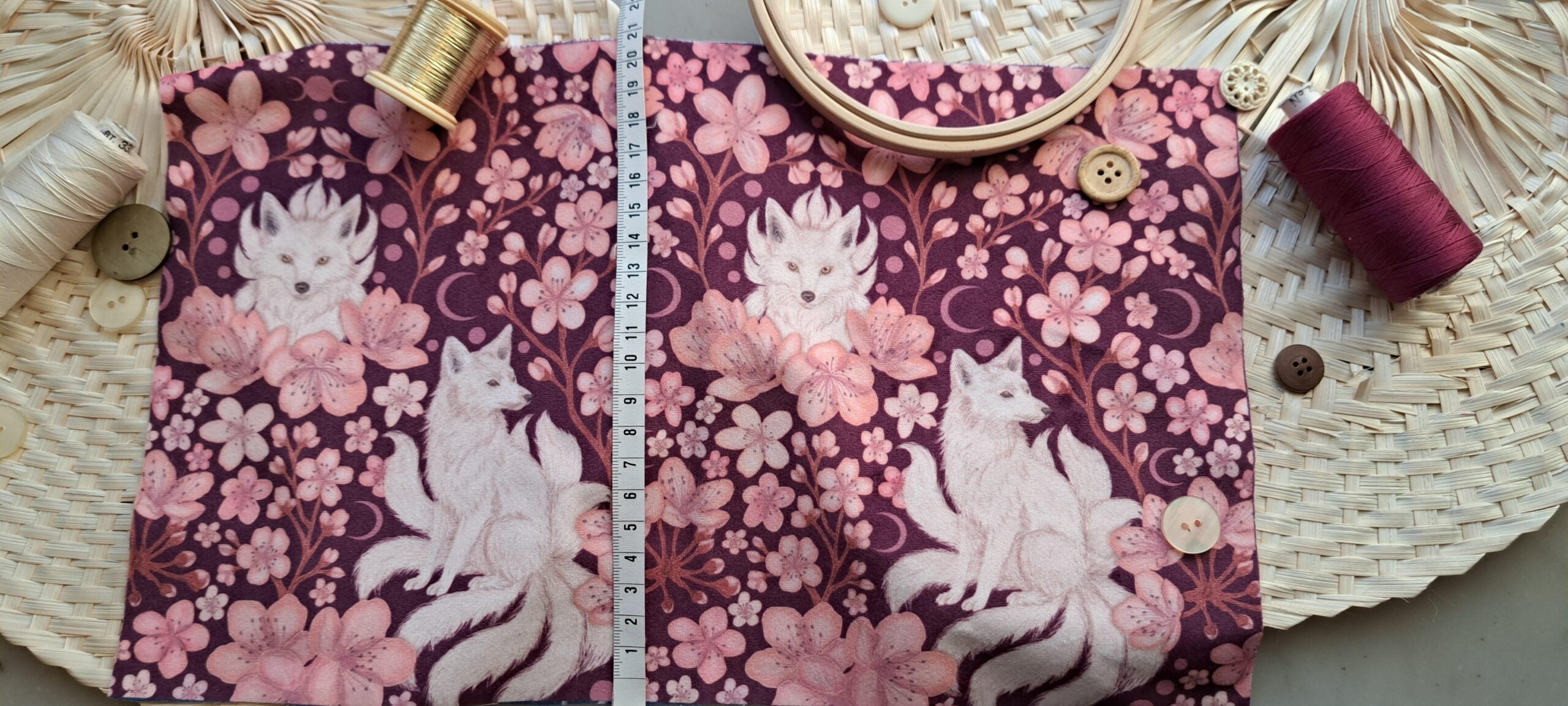 Mon amour pour les cerisiers et les légendes m’a inspiré ce motif : un kitsune blanc à neuf queues, mystérieux gardien des souvenirs et des rêves oubliés.